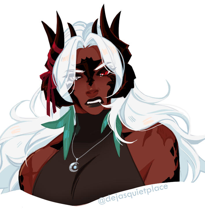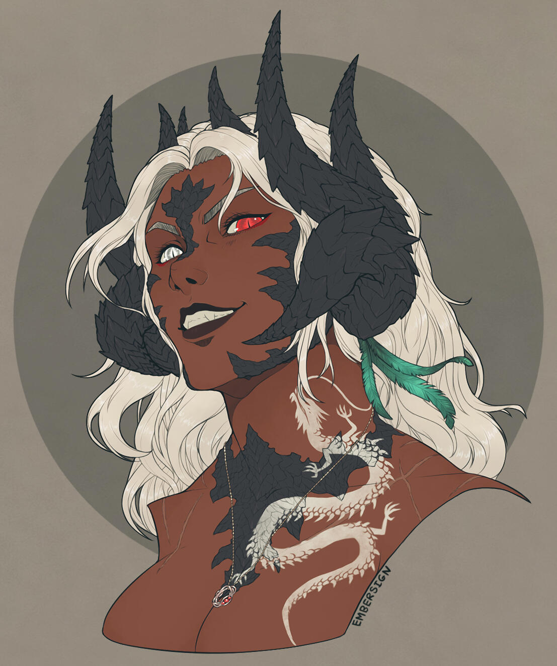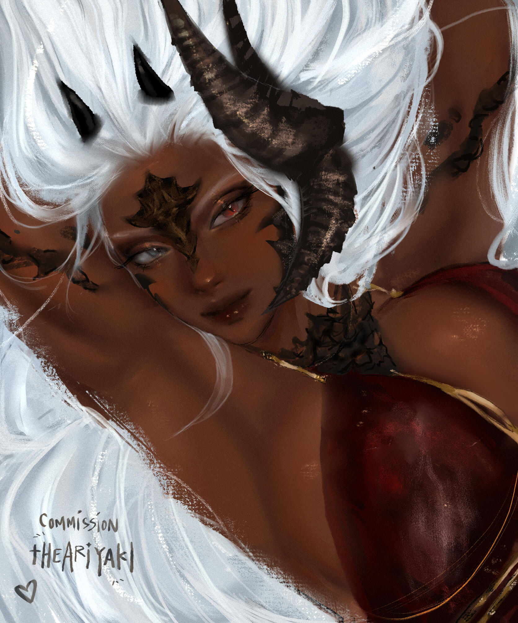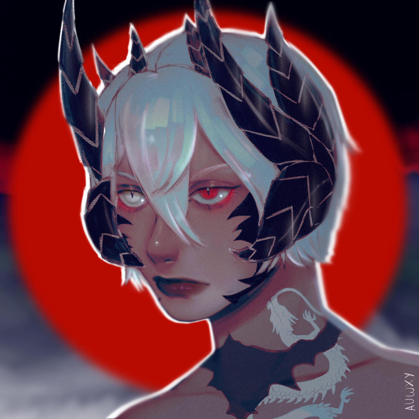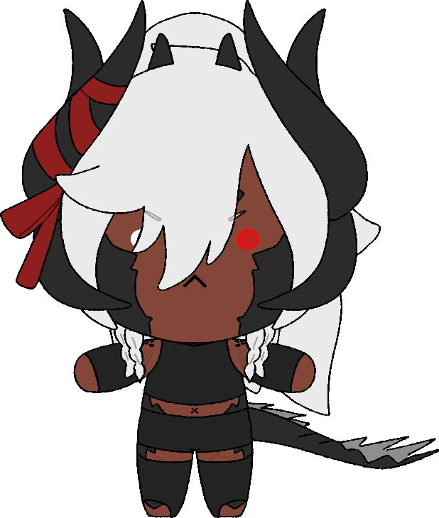 Alduin is a Xaela of 35 cycles, standing tall at 6 fulms, weighing about ~2oo something ponzes. Messy and long locks of snow white hair frame her head, fluffy bangs framing her face contrast her darker skin tone. Her face is angular and sharp - making her quite a looker with unique scale patterns that covers her cheeks and chin. With unique colored eyes - sharp red with a bright red limbal ring as well as white would add to her already unique features. If you look close enough, you can see that she wears some eye makeup; a red eyeshadow on the corner of her eyes that's akin to a brush stroke in replacement of eyeliner befitting of her as well as long curled lashes.Due to her years of training as well as her fighting history, Alduin's body is well-proportioned and well-built, though a much more stronger lower body, having more of an athlete's build - akin to a wrestler. She has different features compared to other Xaela's; reptilian eyes, black scales, several horns as well as a sharp tail that she uses akin to a weapon - parts of the base of her tail and the edge silver to replicate a weapon.Her weapon of choice was once only her lance. But lately she picked up a scythe, along with carrying a greatsword - she adopted the two as as her weapon of choice as of late. Throughout her travels and training, she picked up on more weapons, becoming an expertise in handling nearly every single one. It's what makes her lethal in a fight - having knowledge of any weapon as well as her tail at her disposal made her a force to be reckon with.