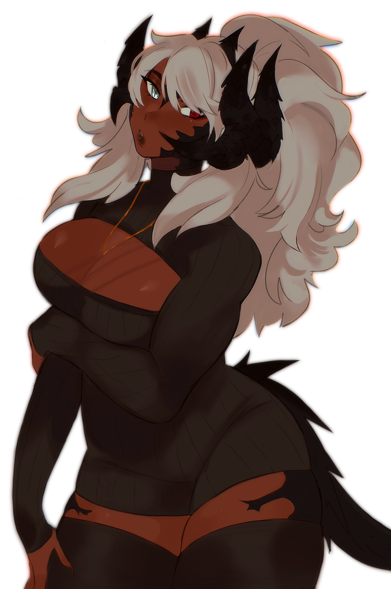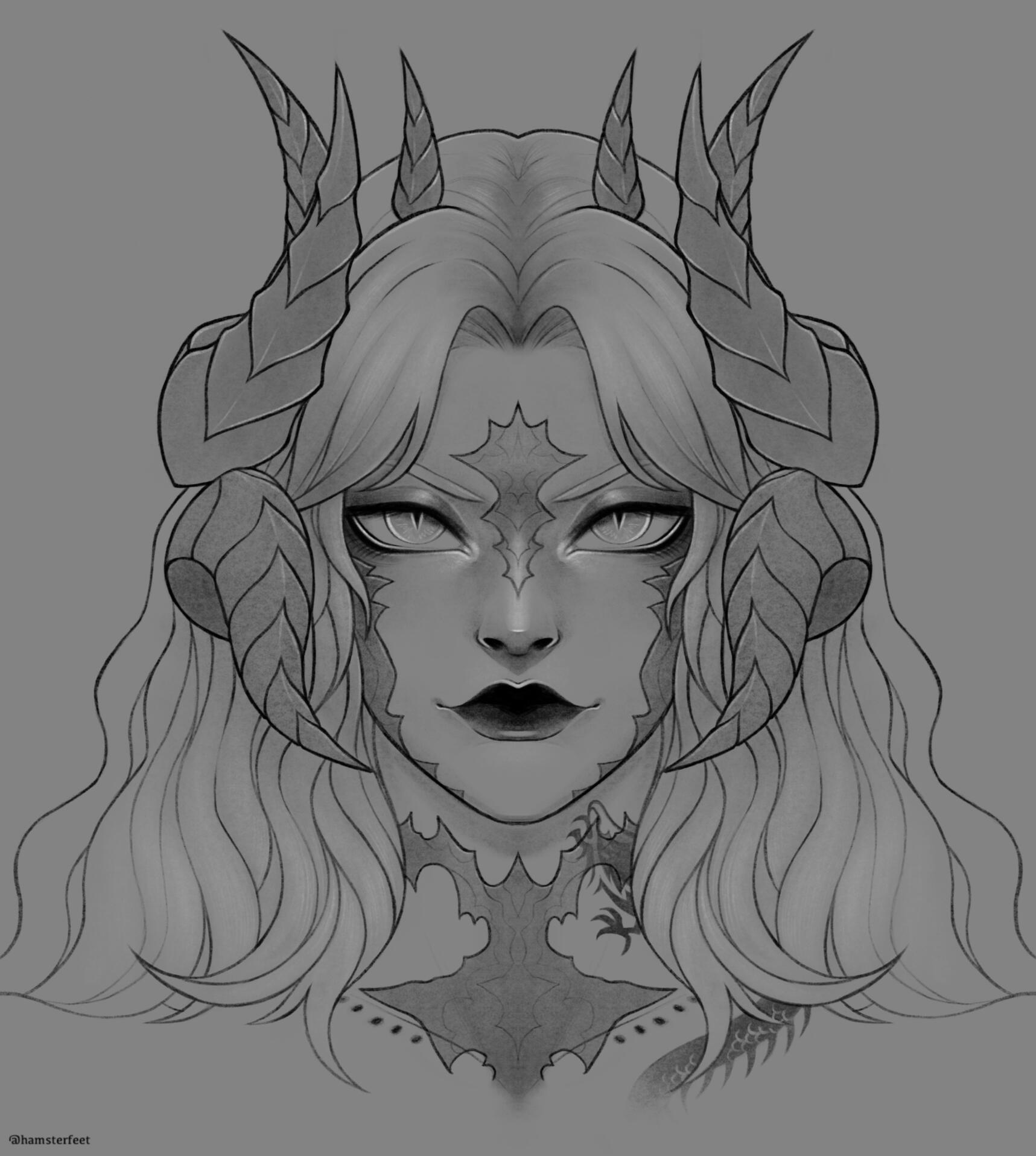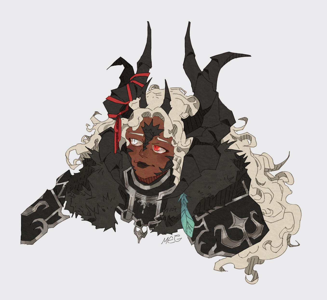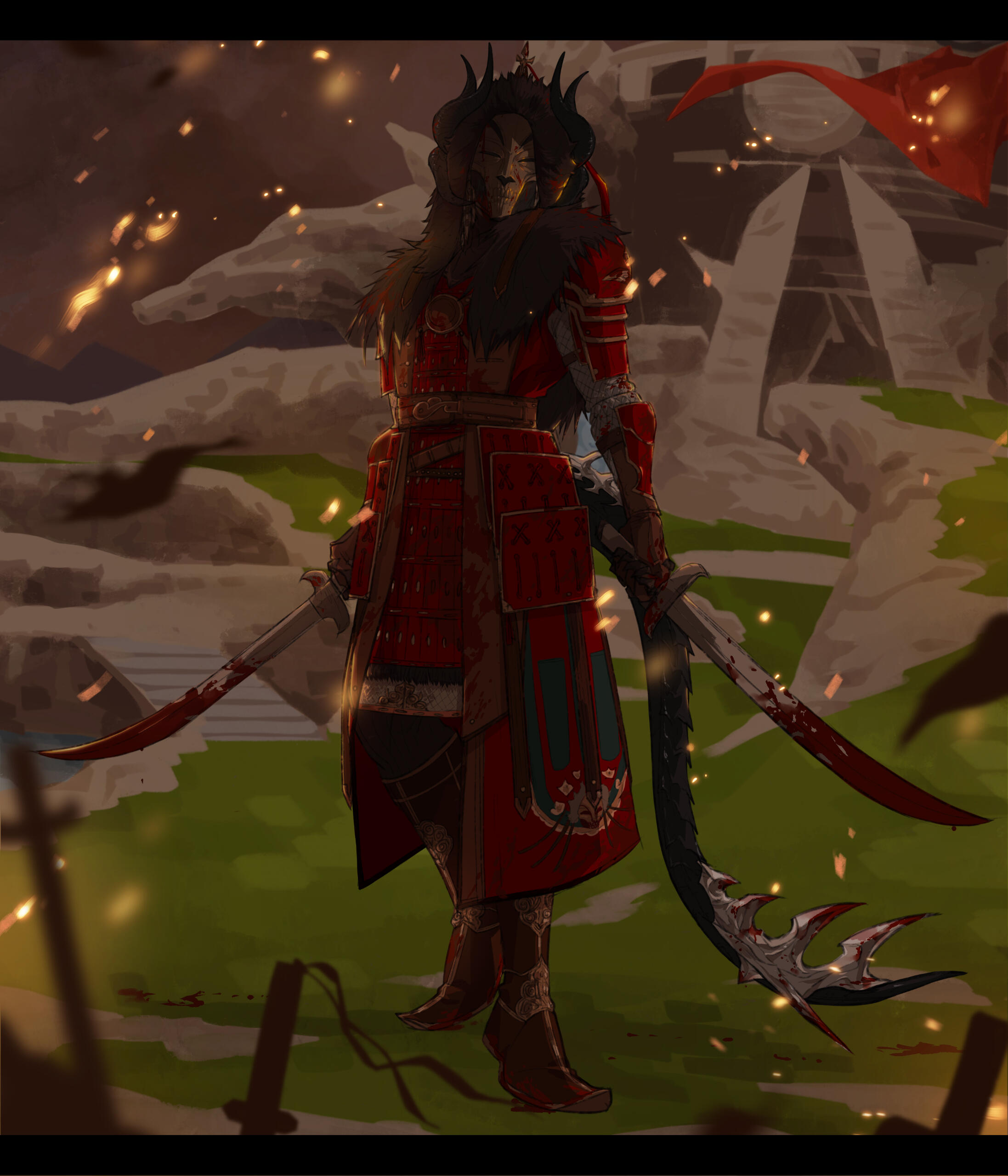 Alduin is a Xaela of 35 cycles, standing tall at 6 fulms, weighing about ~2oo something ponzes. Messy and long locks of snow white hair frame her head, fluffy bangs framing her face contrast her darker skin tone. Her face is angular and sharp - making her quite a looker with unique scale patterns that covers her cheeks and chin. With unique colored eyes - sharp red with a bright red limbal ring as well as white would add to her already unique features. If you look close enough, you can see that she wears some eye makeup; a red eyeshadow on the corner of her eyes that's akin to a brush stroke in replacement of eyeliner befitting of her as well as long curled lashes.Due to her years of training as well as her fighting history, Alduin's body is well-proportioned and well-built, though a much more stronger lower body, having more of an athlete's build - akin to a wrestler. She has different features compared to other Xaela's; reptilian eyes, black scales, several horns as well as a sharp tail that she uses akin to a weapon - parts of the base of her tail and the edge silver to replicate a weapon.Her weapon of choice was once only her lance. But lately she picked up a scythe, along with carrying a greatsword - she adopted the two as as her weapon of choice as of late. Throughout her travels and training, she picked up on more weapons, becoming an expertise in handling nearly every single one. It's what makes her lethal in a fight - having knowledge of any weapon as well as her tail at her disposal made her a force to be reckon with.