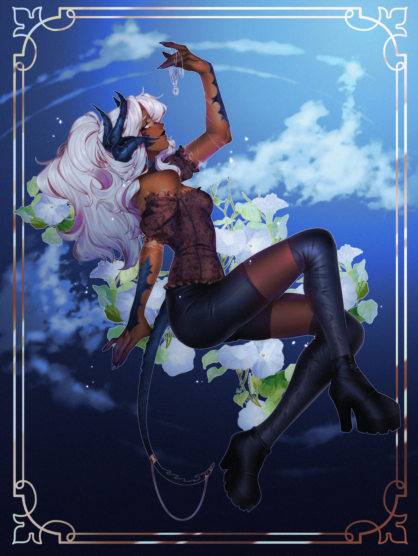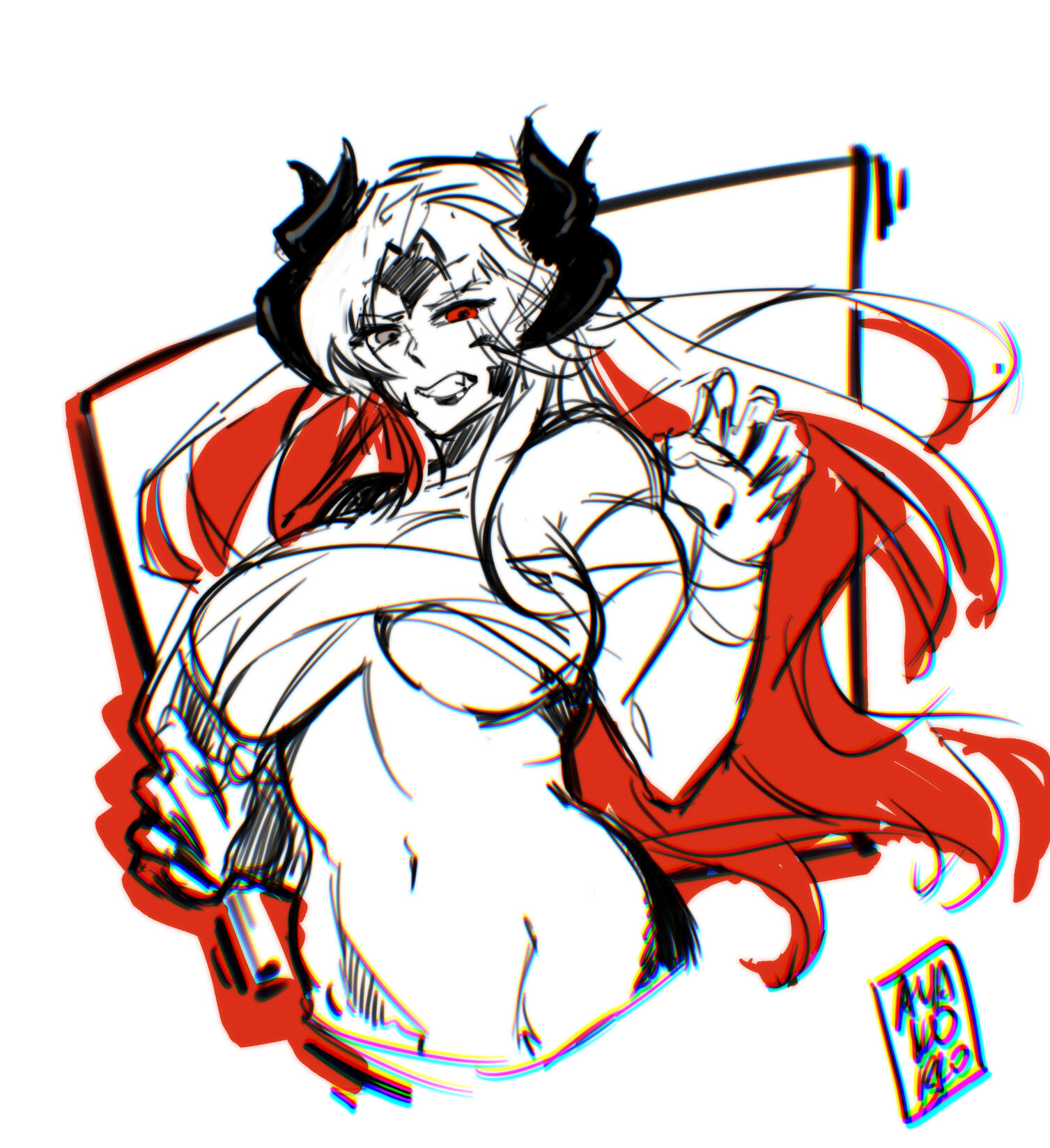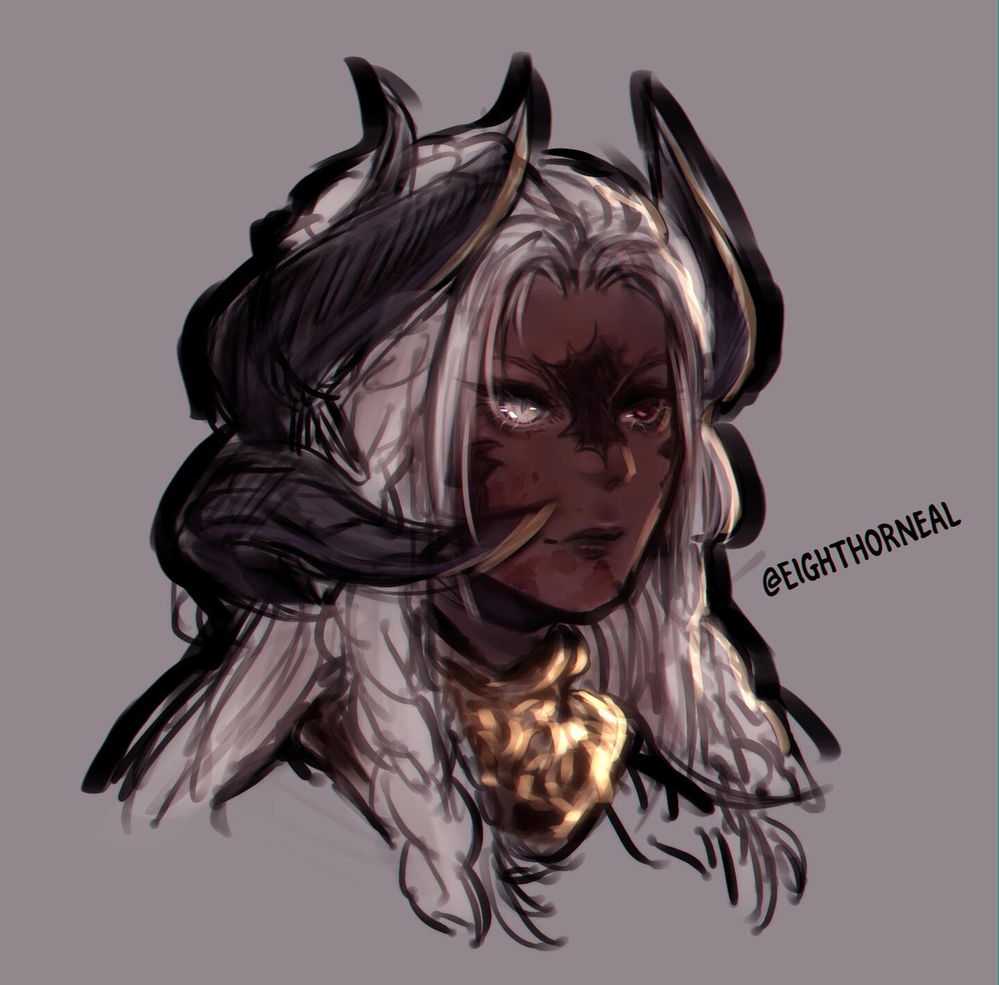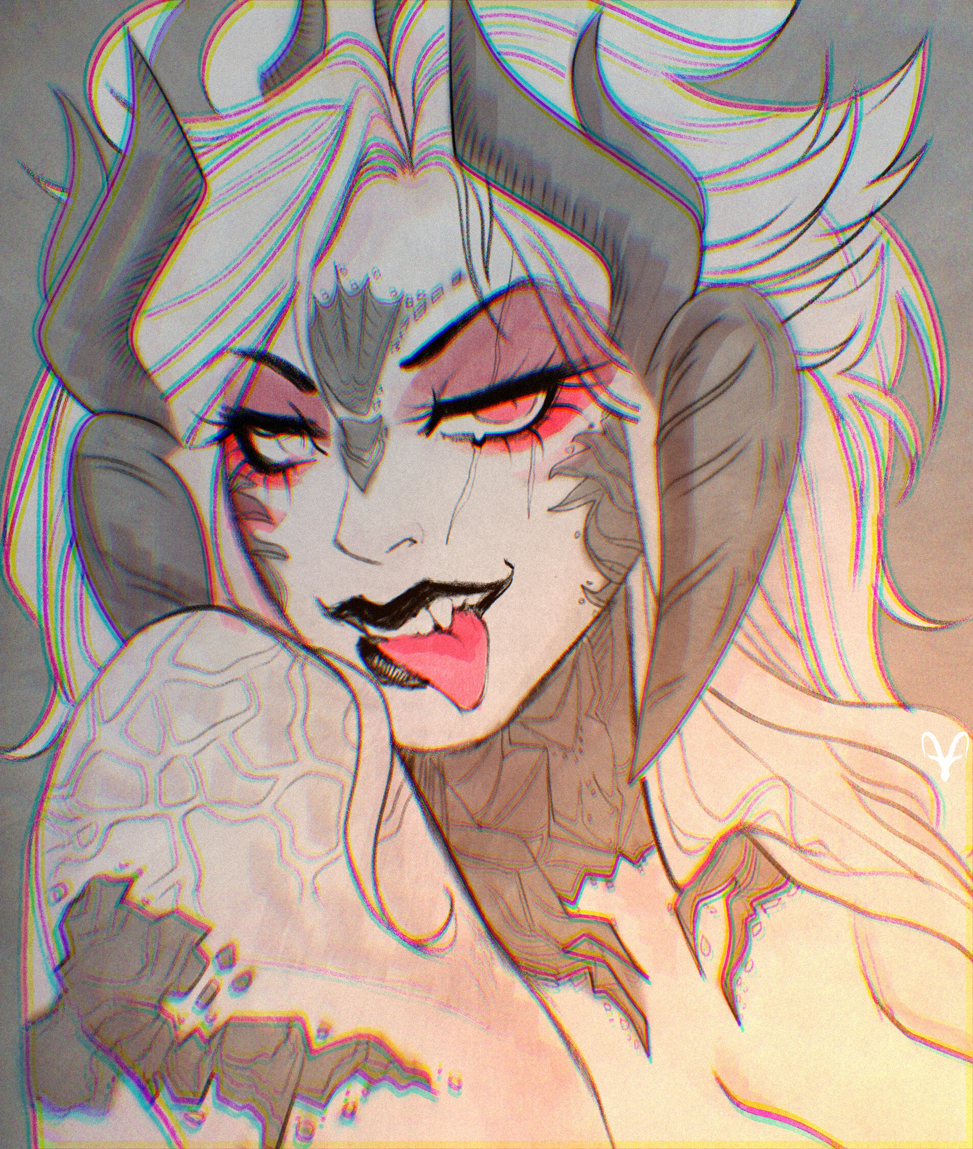 Alduin is a Xaela of 35 cycles, standing tall at 6 fulms, weighing about ~2oo something ponzes. Messy and long locks of snow white hair frame her head, fluffy bangs framing her face contrast her darker skin tone. Her face is angular and sharp - making her quite a looker with unique scale patterns that covers her cheeks and chin. With unique colored eyes - sharp red with a bright red limbal ring as well as white would add to her already unique features. If you look close enough, you can see that she wears some eye makeup; a red eyeshadow on the corner of her eyes that's akin to a brush stroke in replacement of eyeliner befitting of her as well as long curled lashes.Due to her years of training as well as her fighting history, Alduin's body is well-proportioned and well-built, though a much more stronger lower body, having more of an athlete's build - akin to a wrestler. She has different features compared to other Xaela's; reptilian eyes, black scales, several horns as well as a sharp tail that she uses akin to a weapon - parts of the base of her tail and the edge silver to replicate a weapon.Her weapon of choice was once only her lance. But lately she picked up a scythe, along with carrying a greatsword - she adopted the two as as her weapon of choice as of late. Throughout her travels and training, she picked up on more weapons, becoming an expertise in handling nearly every single one. It's what makes her lethal in a fight - having knowledge of any weapon as well as her tail at her disposal made her a force to be reckon with.