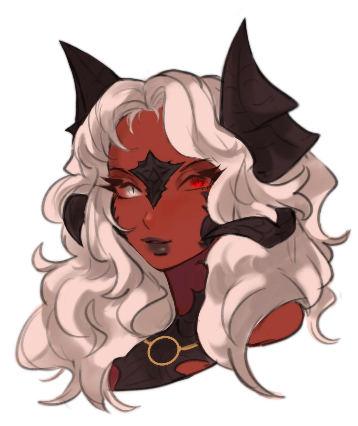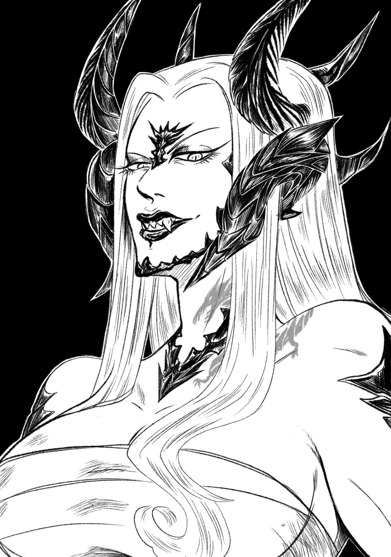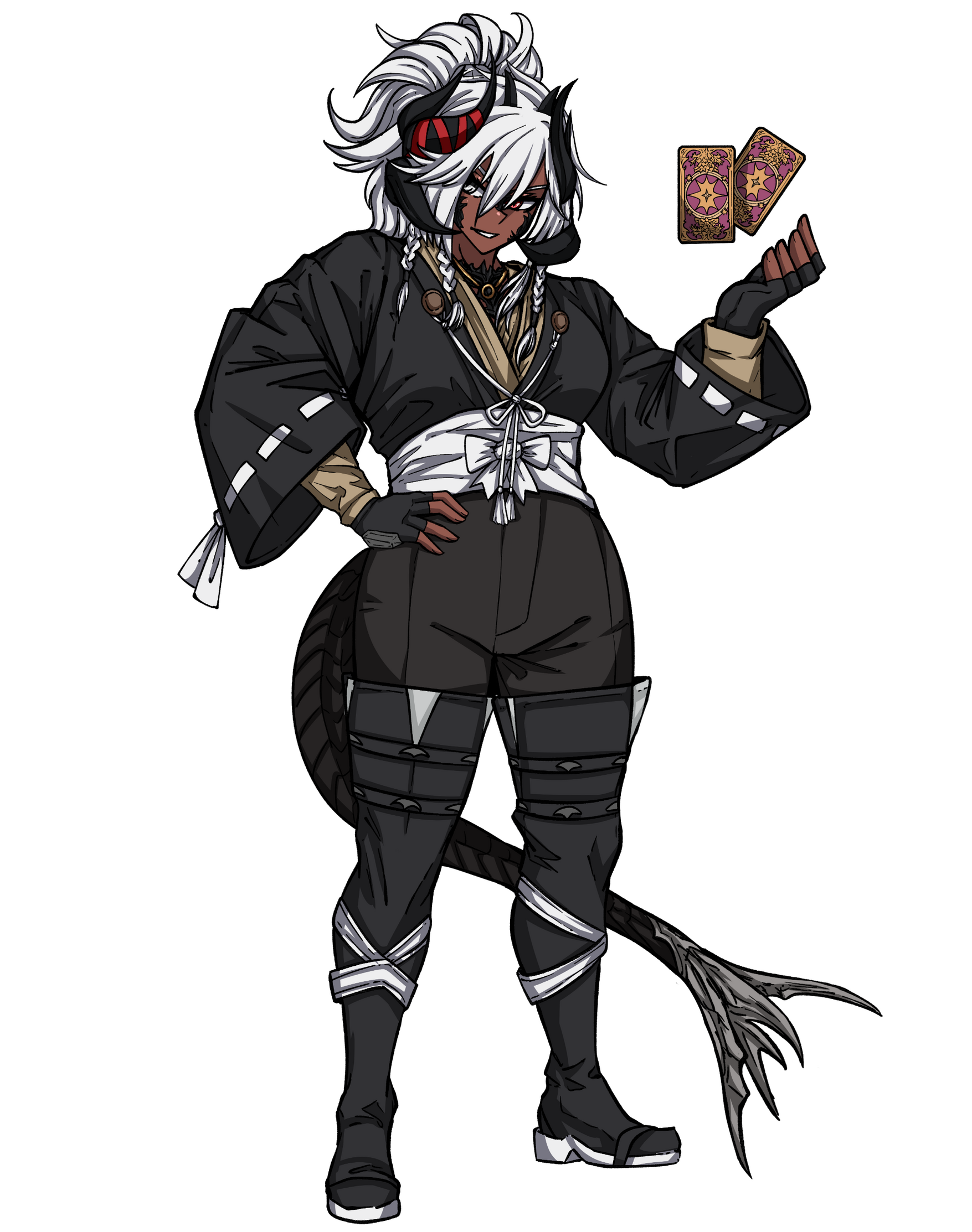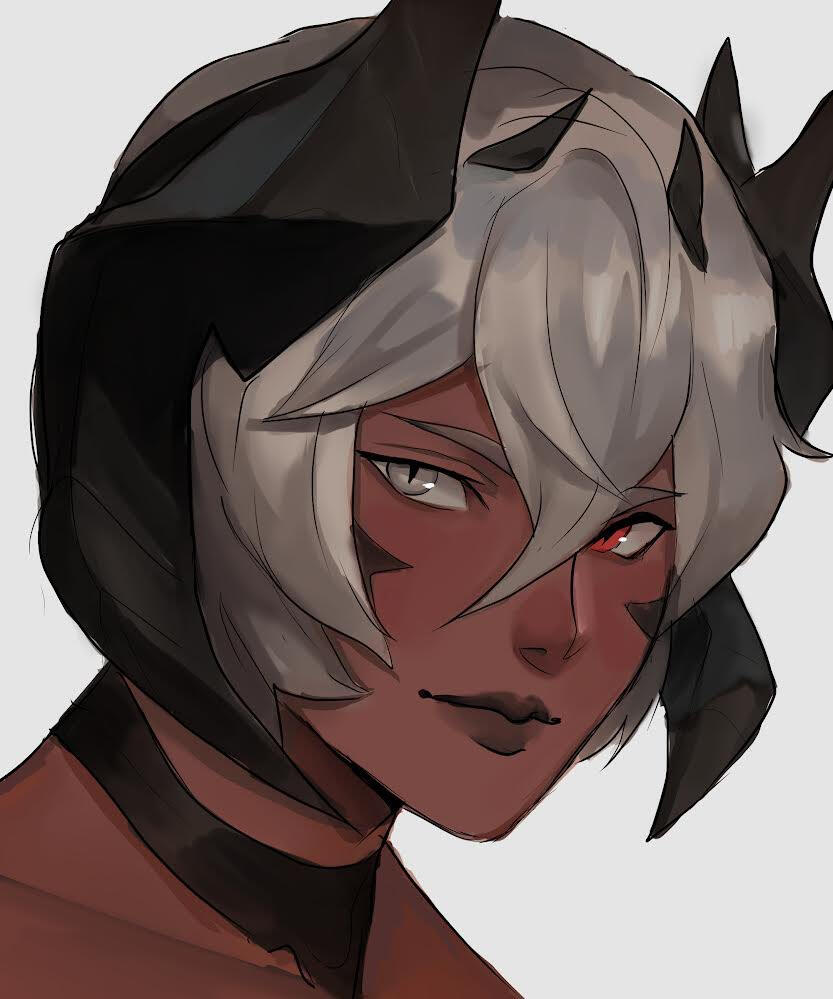 Alduin is a Xaela of 35 cycles, standing tall at 6 fulms, weighing about ~2oo something ponzes. Messy and long locks of snow white hair frame her head, fluffy bangs framing her face contrast her darker skin tone. Her face is angular and sharp - making her quite a looker with unique scale patterns that covers her cheeks and chin. With unique colored eyes - sharp red with a bright red limbal ring as well as white would add to her already unique features. If you look close enough, you can see that she wears some eye makeup; a red eyeshadow on the corner of her eyes that's akin to a brush stroke in replacement of eyeliner befitting of her as well as long curled lashes.Due to her years of training as well as her fighting history, Alduin's body is well-proportioned and well-built, though a much more stronger lower body, having more of an athlete's build - akin to a wrestler. She has different features compared to other Xaela's; reptilian eyes, black scales, several horns as well as a sharp tail that she uses akin to a weapon - parts of the base of her tail and the edge silver to replicate a weapon.Her weapon of choice was once only her lance. But lately she picked up a scythe, along with carrying a greatsword - she adopted the two as as her weapon of choice as of late. Throughout her travels and training, she picked up on more weapons, becoming an expertise in handling nearly every single one. It's what makes her lethal in a fight - having knowledge of any weapon as well as her tail at her disposal made her a force to be reckon with.