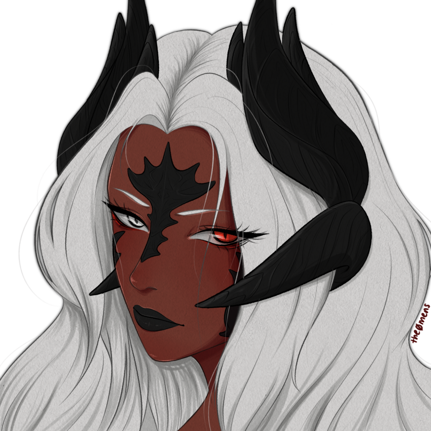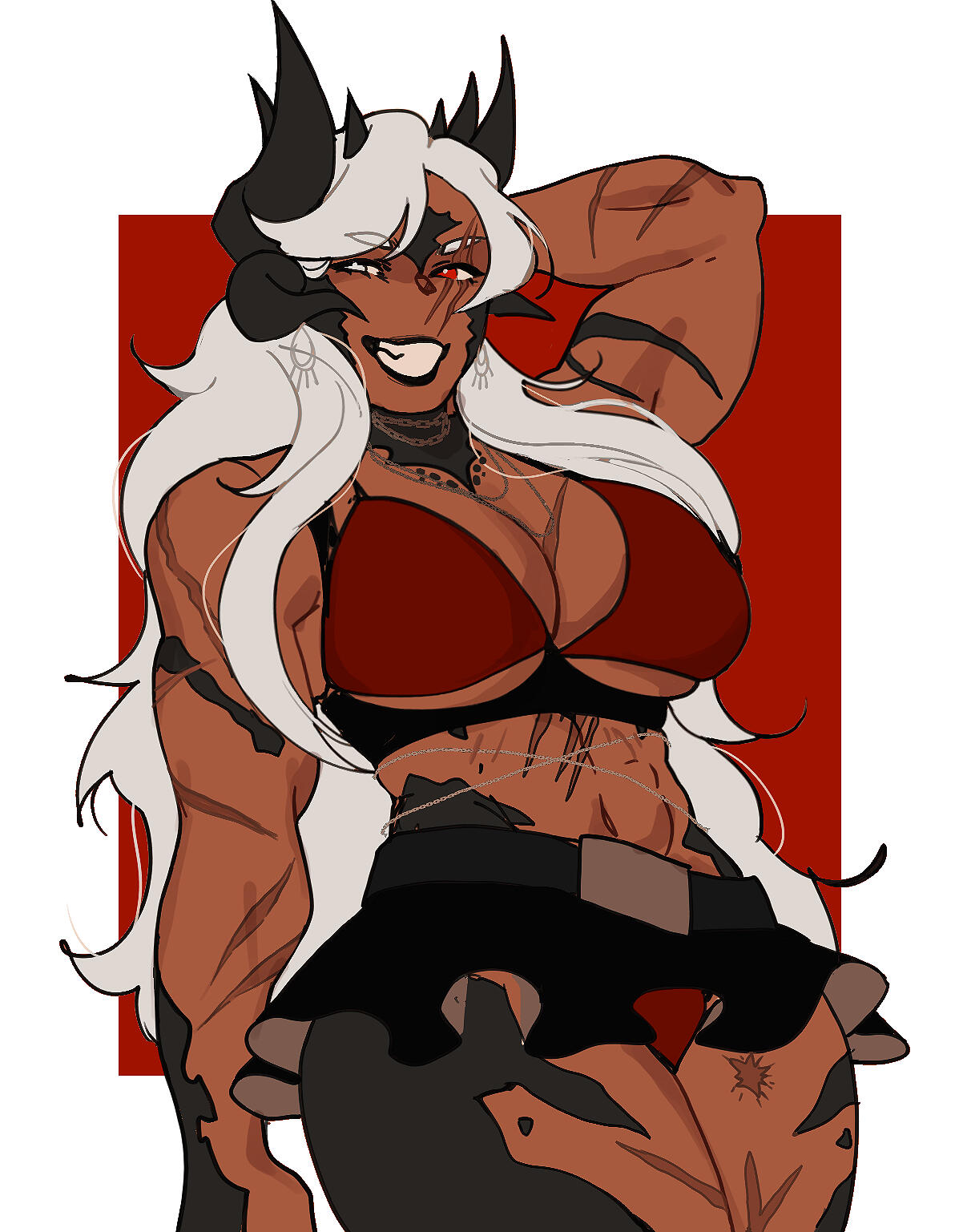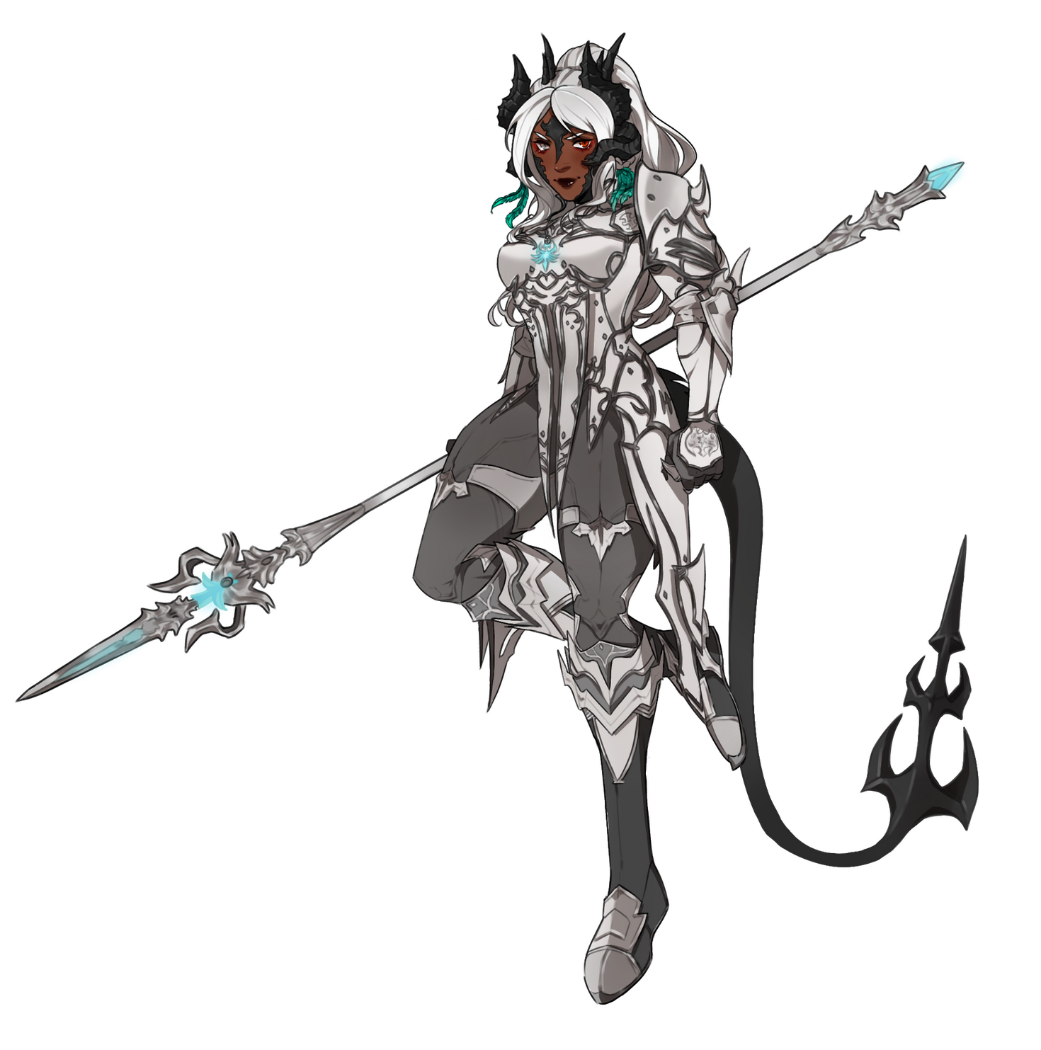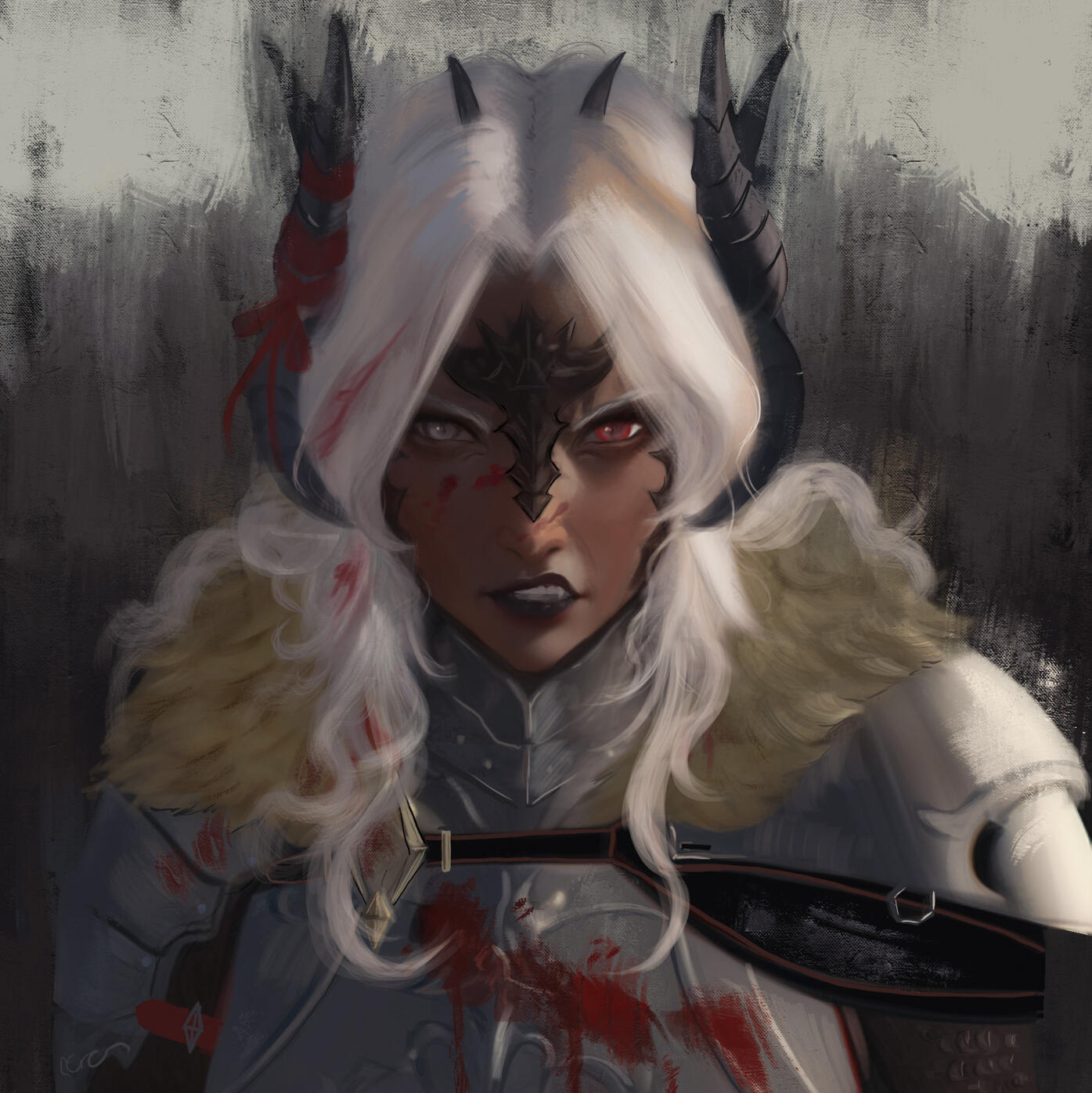 Alduin is a Xaela of 35 cycles, standing tall at 6 fulms, weighing about ~2oo something ponzes. Messy and long locks of snow white hair frame her head, fluffy bangs framing her face contrast her darker skin tone. Her face is angular and sharp - making her quite a looker with unique scale patterns that covers her cheeks and chin. With unique colored eyes - sharp red with a bright red limbal ring as well as white would add to her already unique features. If you look close enough, you can see that she wears some eye makeup; a red eyeshadow on the corner of her eyes that's akin to a brush stroke in replacement of eyeliner befitting of her as well as long curled lashes.Due to her years of training as well as her fighting history, Alduin's body is well-proportioned and well-built, though a much more stronger lower body, having more of an athlete's build - akin to a wrestler. She has different features compared to other Xaela's; reptilian eyes, black scales, several horns as well as a sharp tail that she uses akin to a weapon - parts of the base of her tail and the edge silver to replicate a weapon.Her weapon of choice was once only her lance. But lately she picked up a scythe, along with carrying a greatsword - she adopted the two as as her weapon of choice as of late. Throughout her travels and training, she picked up on more weapons, becoming an expertise in handling nearly every single one. It's what makes her lethal in a fight - having knowledge of any weapon as well as her tail at her disposal made her a force to be reckon with.