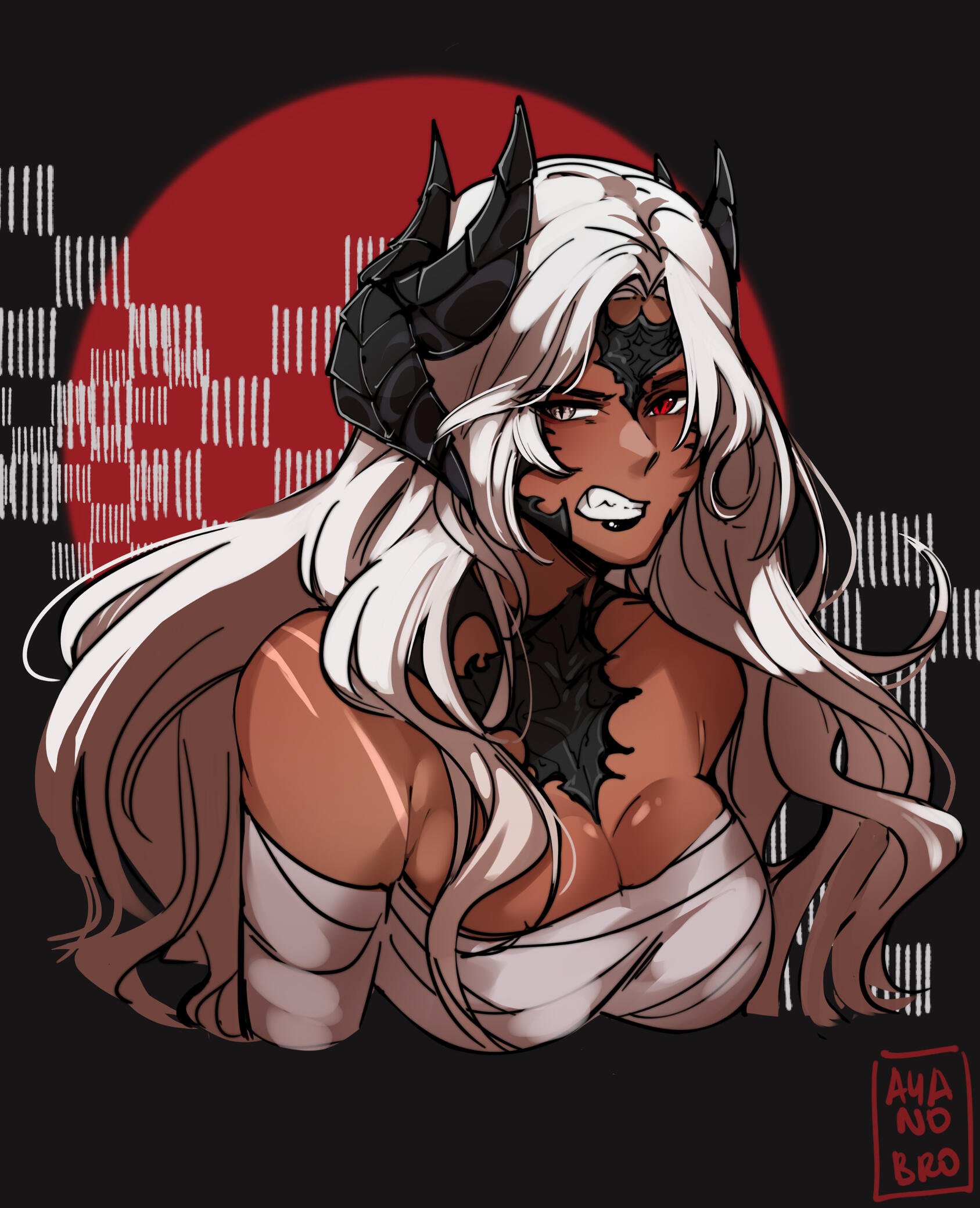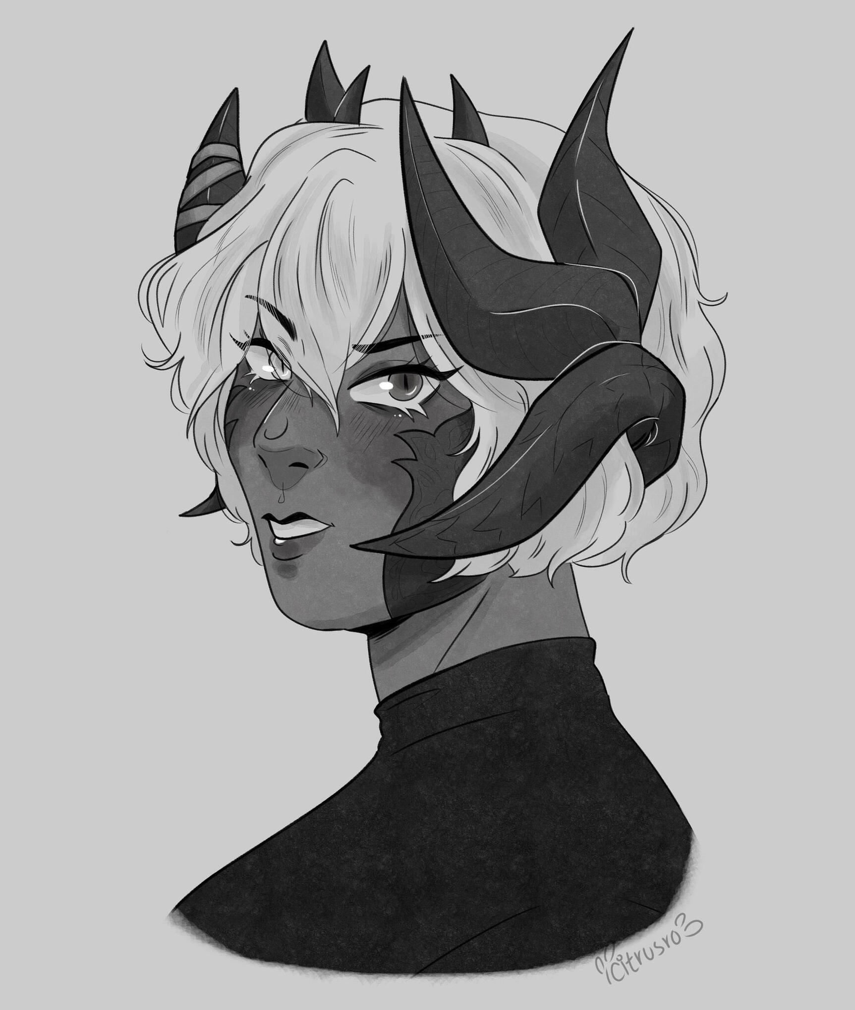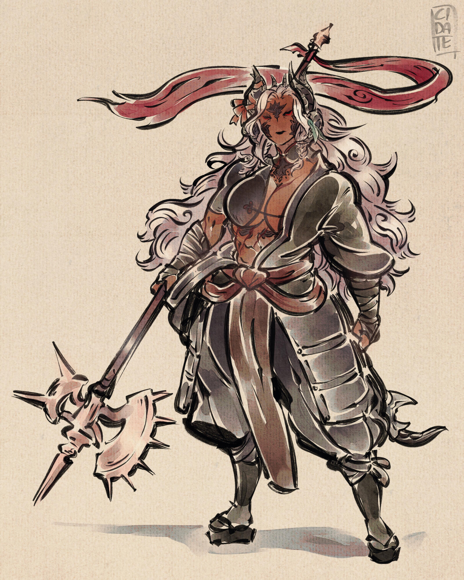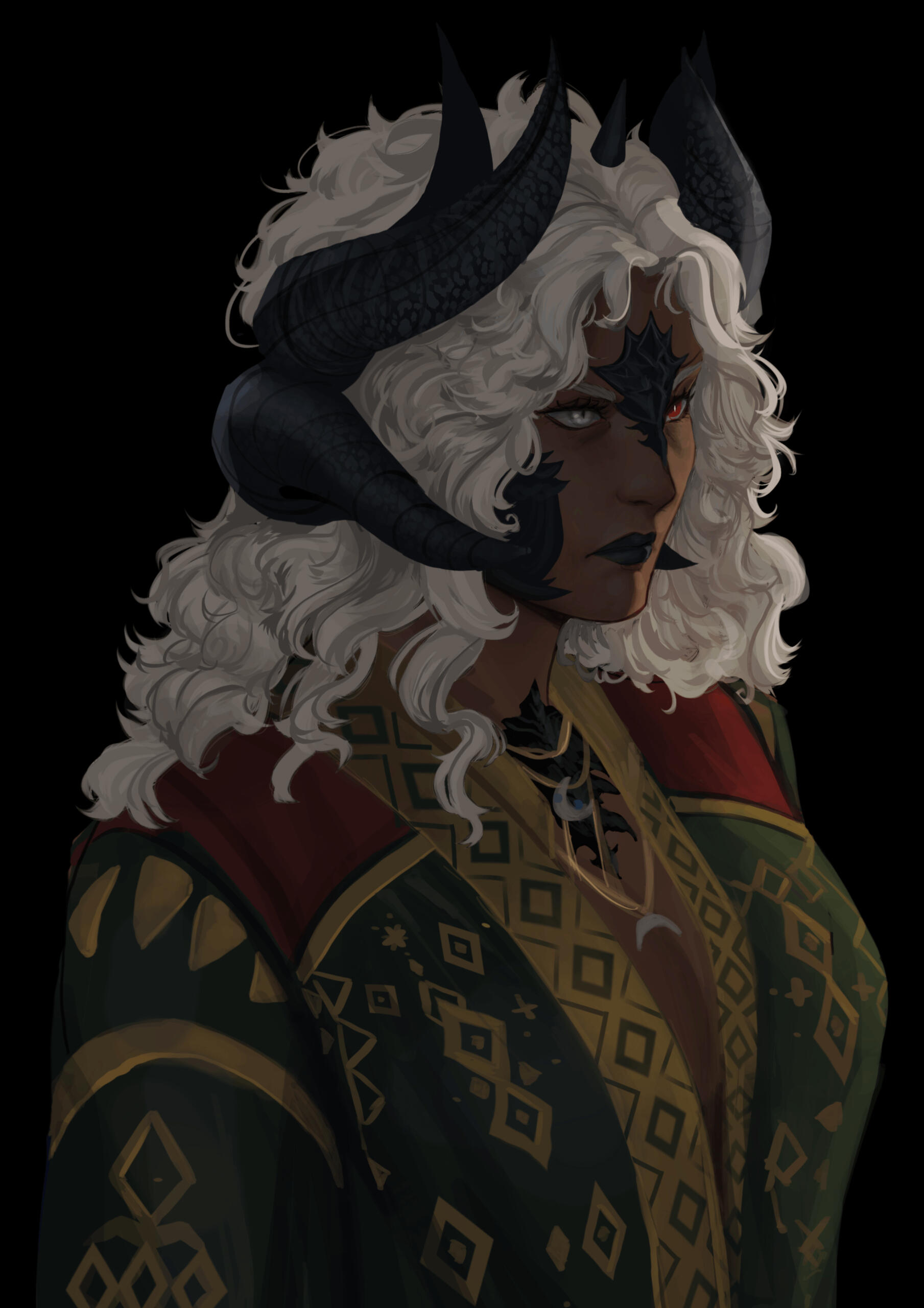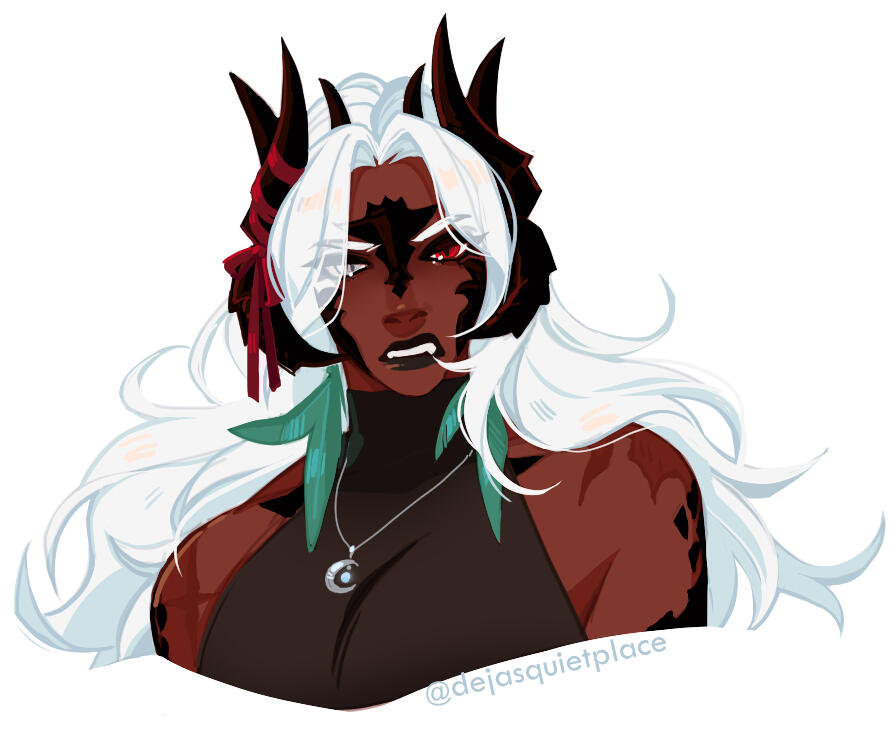 Alduin is a Xaela of 35 cycles, standing tall at 6 fulms, weighing about ~2oo something ponzes. Messy and long locks of snow white hair frame her head, fluffy bangs framing her face contrast her darker skin tone. Her face is angular and sharp - making her quite a looker with unique scale patterns that covers her cheeks and chin. With unique colored eyes - sharp red with a bright red limbal ring as well as white would add to her already unique features. If you look close enough, you can see that she wears some eye makeup; a red eyeshadow on the corner of her eyes that's akin to a brush stroke in replacement of eyeliner befitting of her as well as long curled lashes.Due to her years of training as well as her fighting history, Alduin's body is well-proportioned and well-built, though a much more stronger lower body, having more of an athlete's build - akin to a wrestler. She has different features compared to other Xaela's; reptilian eyes, black scales, several horns as well as a sharp tail that she uses akin to a weapon - parts of the base of her tail and the edge silver to replicate a weapon.Her weapon of choice was once only her lance. But lately she picked up a scythe, along with carrying a greatsword - she adopted the two as as her weapon of choice as of late. Throughout her travels and training, she picked up on more weapons, becoming an expertise in handling nearly every single one. It's what makes her lethal in a fight - having knowledge of any weapon as well as her tail at her disposal made her a force to be reckon with.