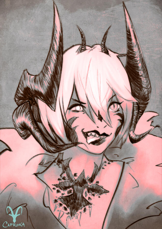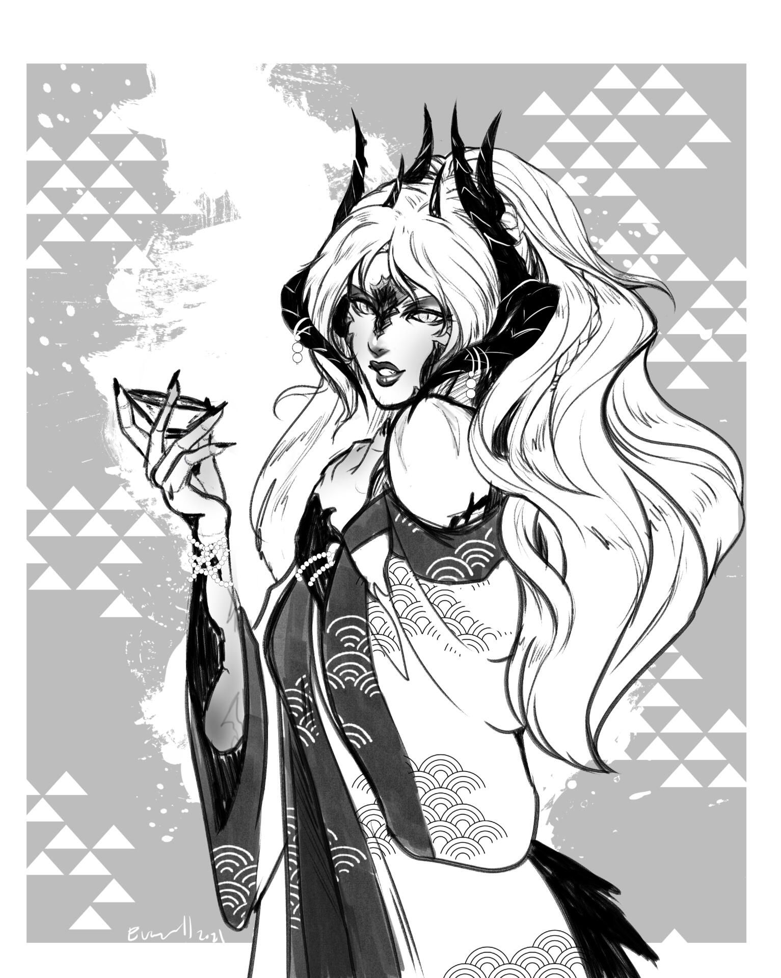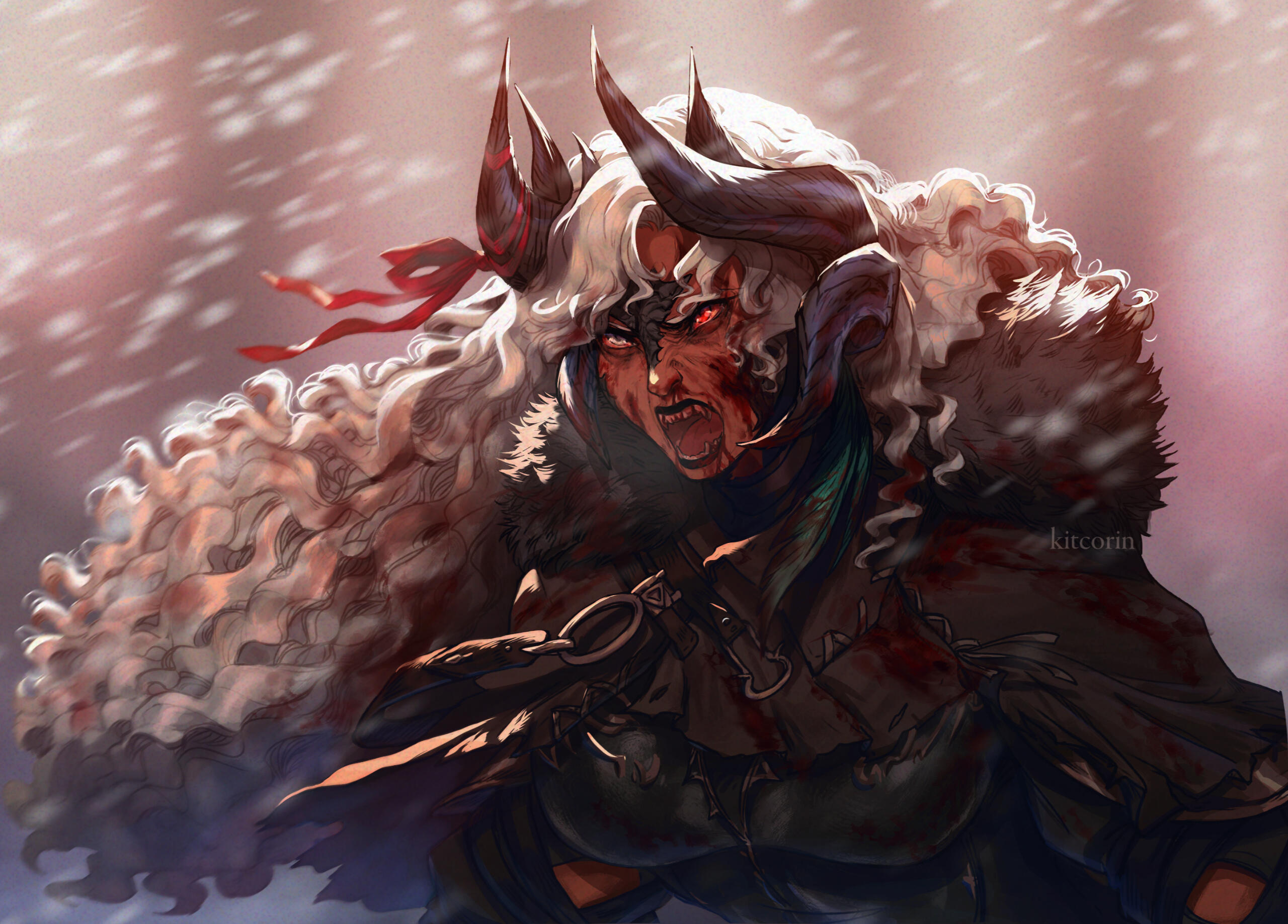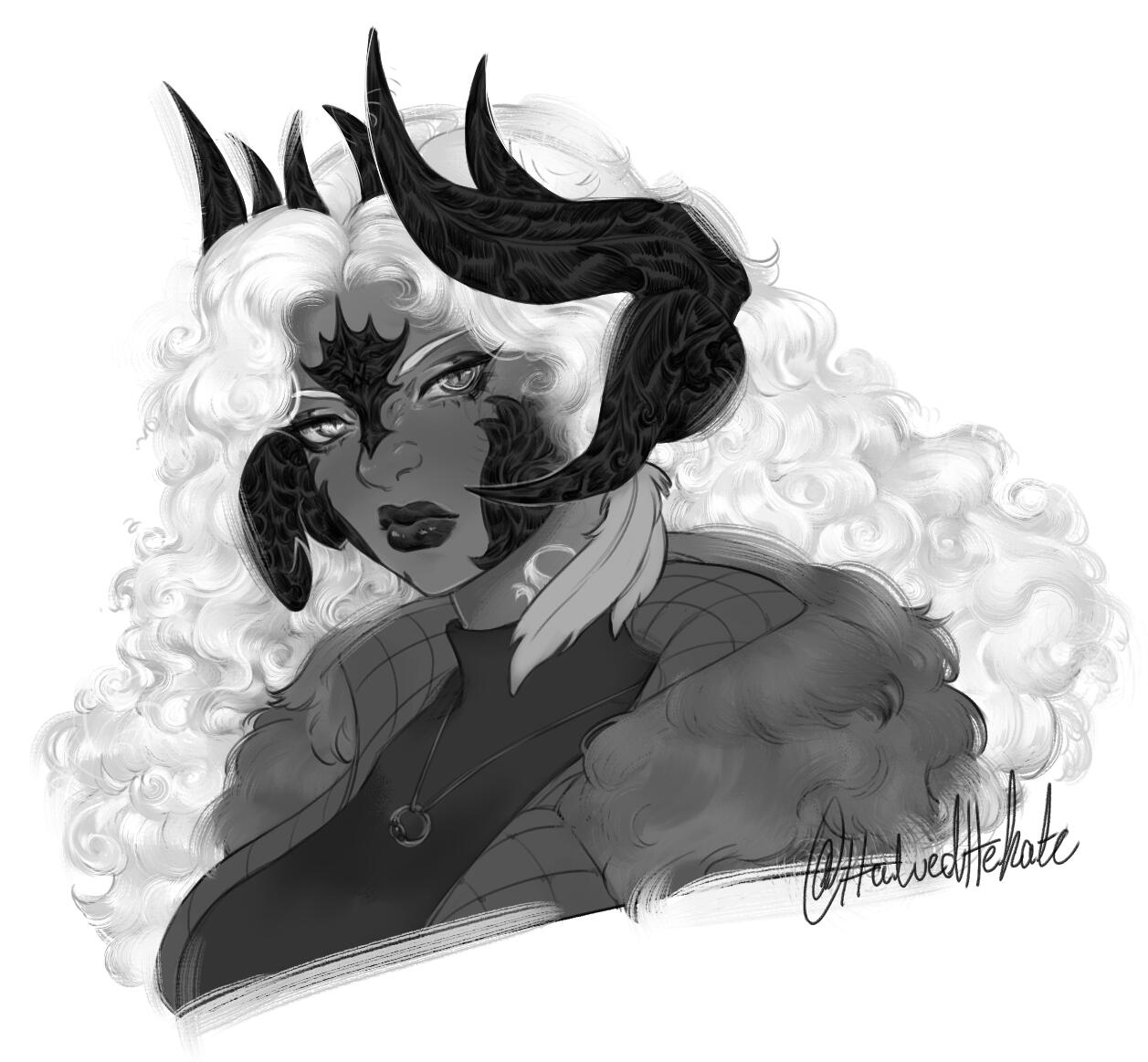 Alduin is a Xaela of 35 cycles, standing tall at 6 fulms, weighing about ~2oo something ponzes. Messy and long locks of snow white hair frame her head, fluffy bangs framing her face contrast her darker skin tone. Her face is angular and sharp - making her quite a looker with unique scale patterns that covers her cheeks and chin. With unique colored eyes - sharp red with a bright red limbal ring as well as white would add to her already unique features. If you look close enough, you can see that she wears some eye makeup; a red eyeshadow on the corner of her eyes that's akin to a brush stroke in replacement of eyeliner befitting of her as well as long curled lashes.Due to her years of training as well as her fighting history, Alduin's body is well-proportioned and well-built, though a much more stronger lower body, having more of an athlete's build - akin to a wrestler. She has different features compared to other Xaela's; reptilian eyes, black scales, several horns as well as a sharp tail that she uses akin to a weapon - parts of the base of her tail and the edge silver to replicate a weapon.Her weapon of choice was once only her lance. But lately she picked up a scythe, along with carrying a greatsword - she adopted the two as as her weapon of choice as of late. Throughout her travels and training, she picked up on more weapons, becoming an expertise in handling nearly every single one. It's what makes her lethal in a fight - having knowledge of any weapon as well as her tail at her disposal made her a force to be reckon with.